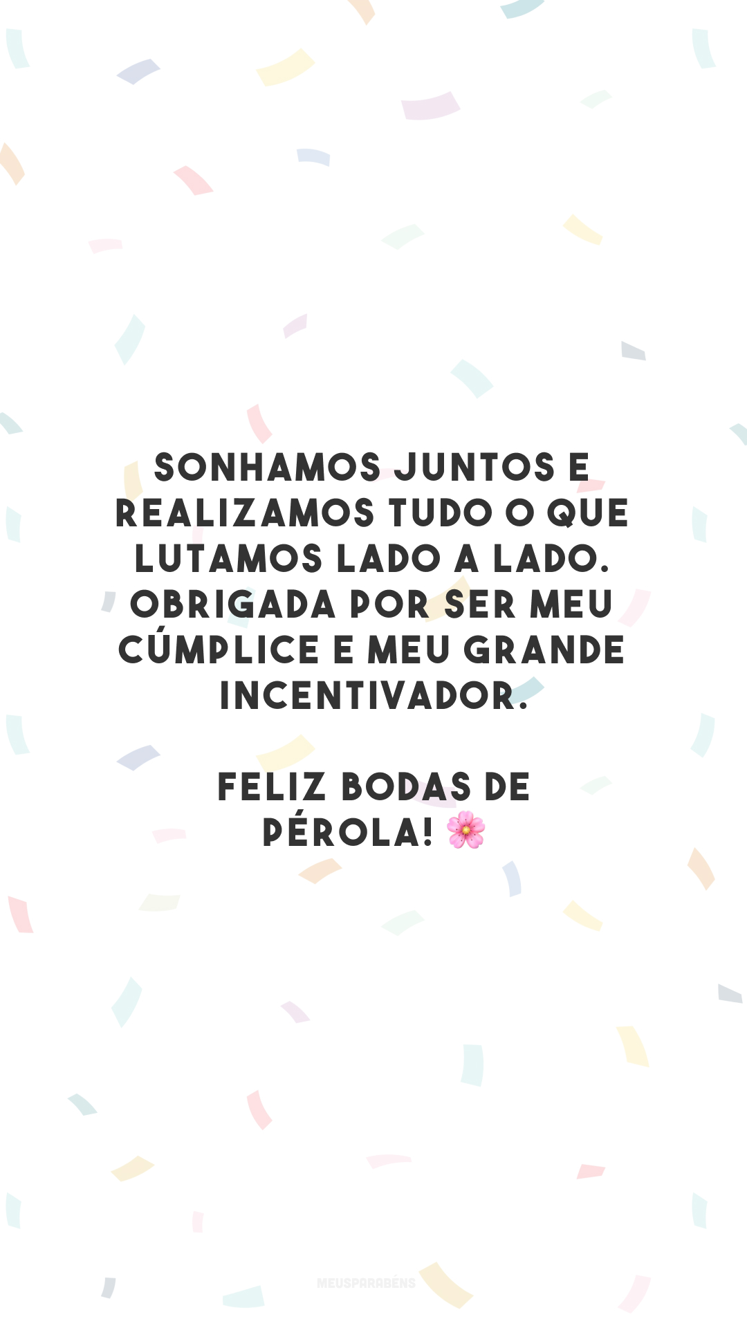 Sonhamos juntos e realizamos tudo o que lutamos lado a lado. Obrigada por ser meu cúmplice e meu grande incentivador. Feliz bodas de pérola! 🌸
