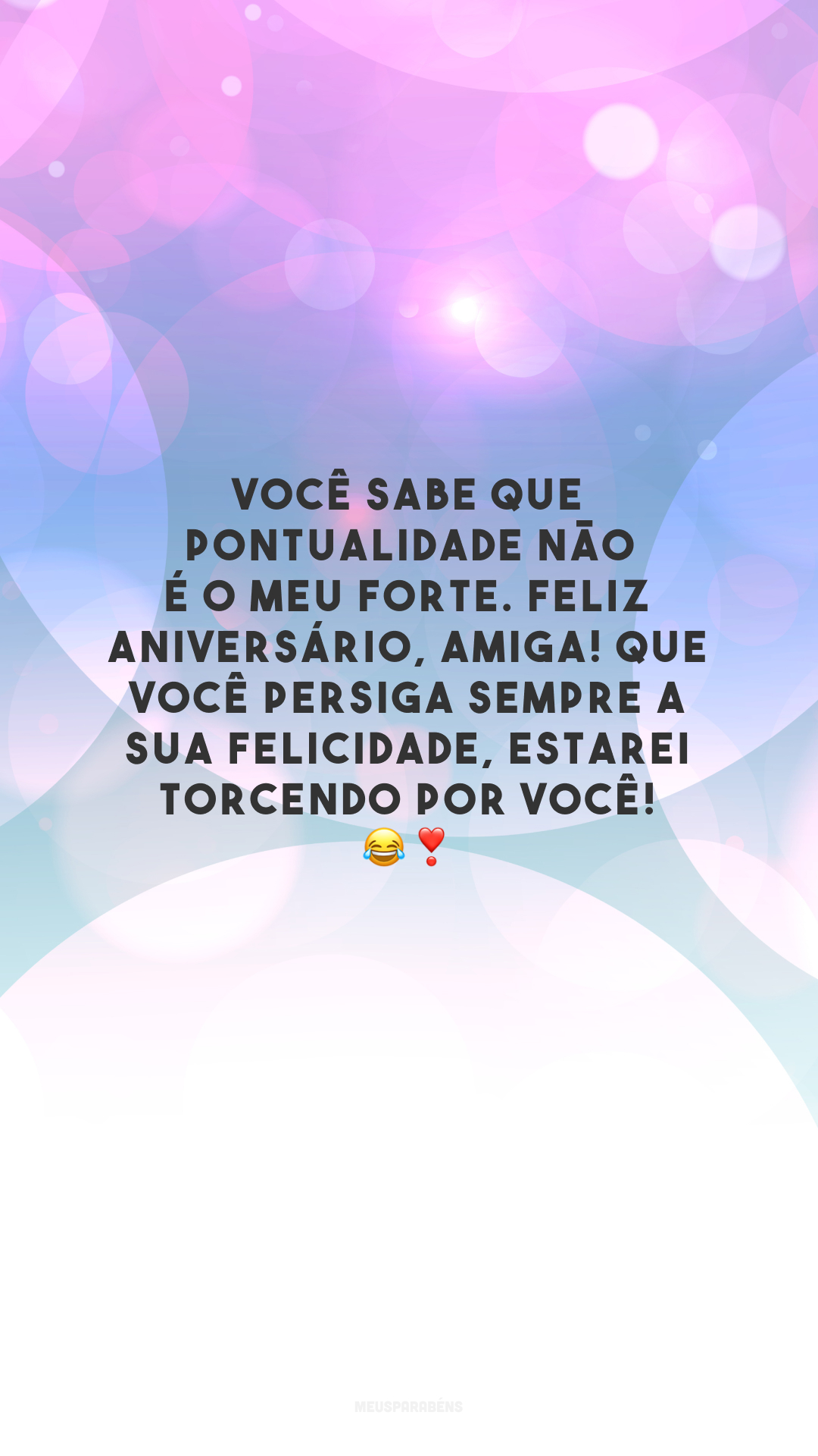 Você sabe que pontualidade não é o meu forte. Feliz aniversário, amiga! Que você persiga sempre a sua felicidade, estarei torcendo por você! 😂❣️
