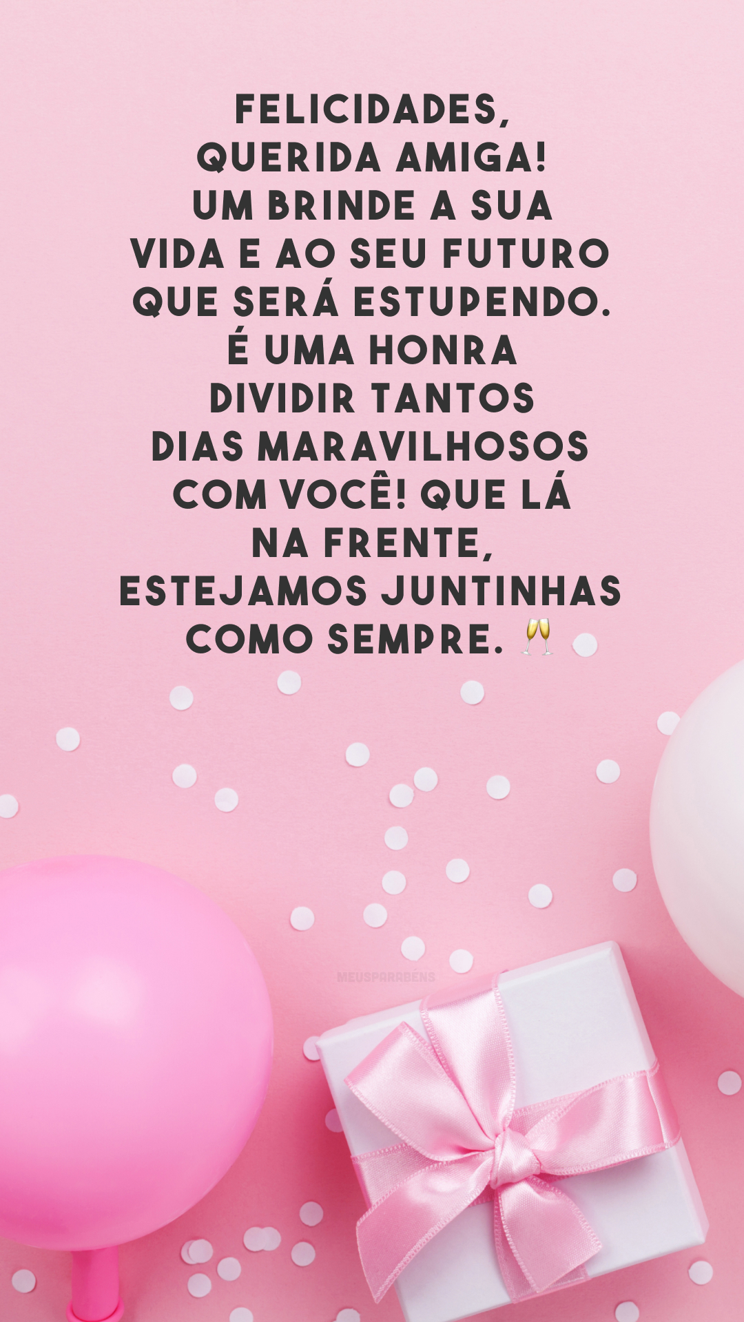 A maior felicidade do mundo é minha por poder te chamar de amiga. Desejo a você muitos sorrisos e festa, faremos hoje ser um dia inesquecível! Feliz aniversário! 🥂