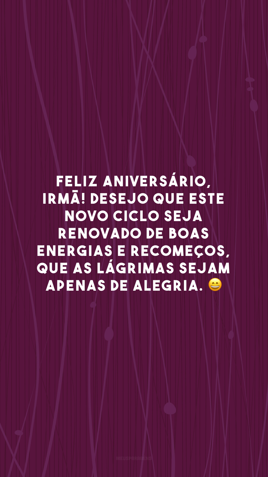 Feliz aniversário, irmã! Desejo que este novo ciclo seja renovado de boas energias e recomeços, que as lágrimas sejam apenas de alegria. 😄