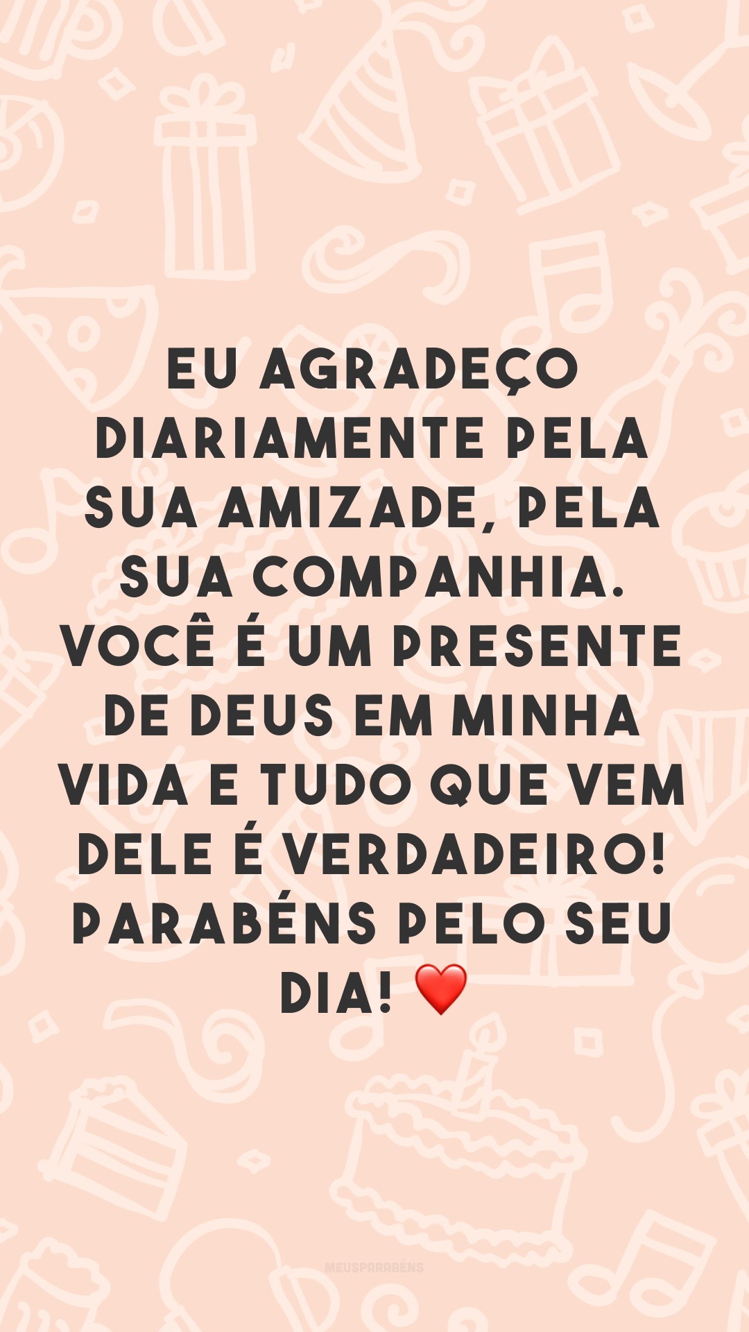 Eu agradeço diariamente pela sua amizade, pela sua companhia. Você é um presente de Deus em minha vida e tudo que vem Dele é verdadeiro! Parabéns pelo seu dia! ❤