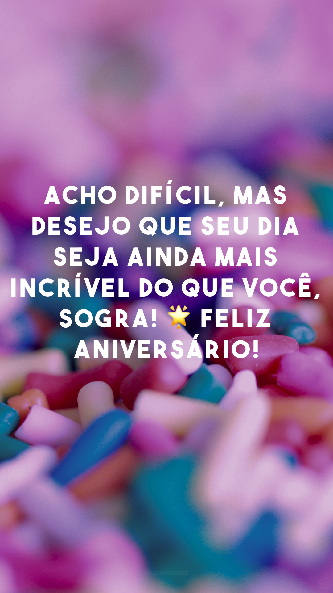 Acho difícil, mas desejo que seu dia seja ainda mais incrível do que você, sogra! 🌟 Feliz aniversário!
