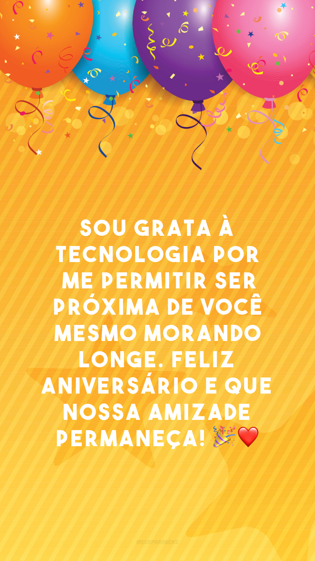 Sou grata à tecnologia por me permitir ser próxima de você mesmo morando longe. Feliz aniversário e que nossa amizade permaneça! 🎉❤