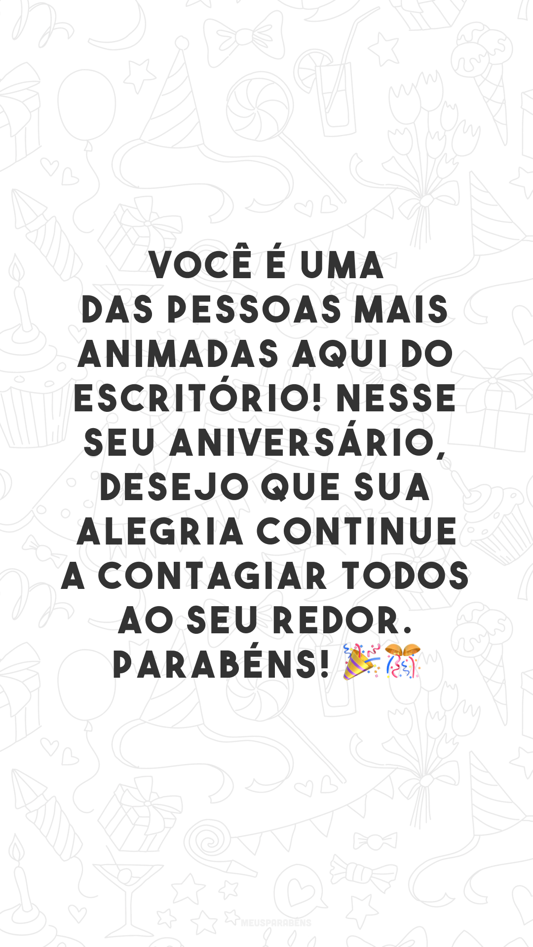 Você é uma das pessoas mais animadas aqui do escritório! Nesse seu aniversário, desejo que sua alegria continue a contagiar todos ao seu redor. Parabéns! 🎉🎊