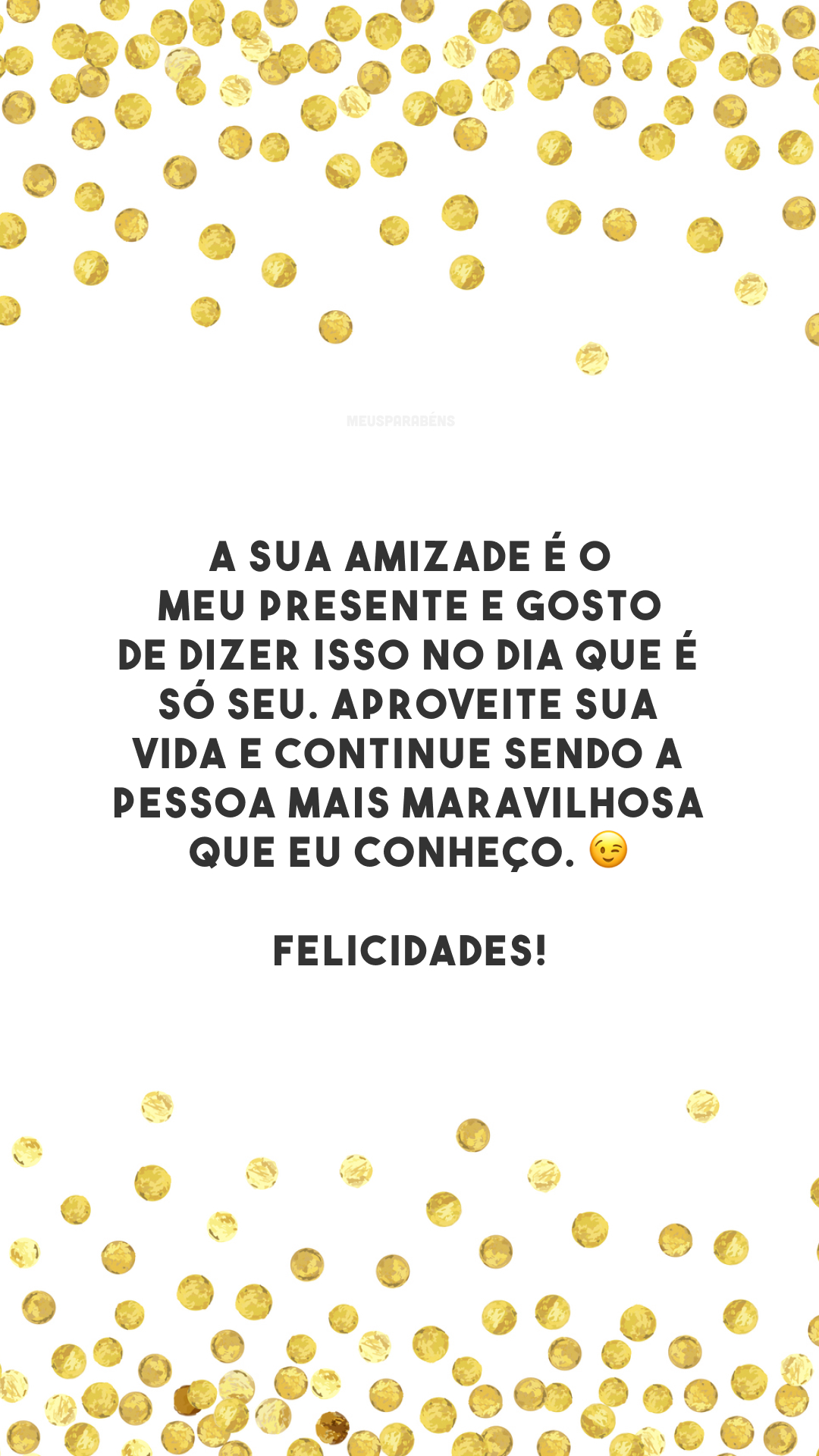 A sua amizade é o meu presente e gosto de dizer isso no dia que é só seu. Aproveite sua vida e continue sendo a pessoa mais maravilhosa que eu conheço. 😉 Felicidades!