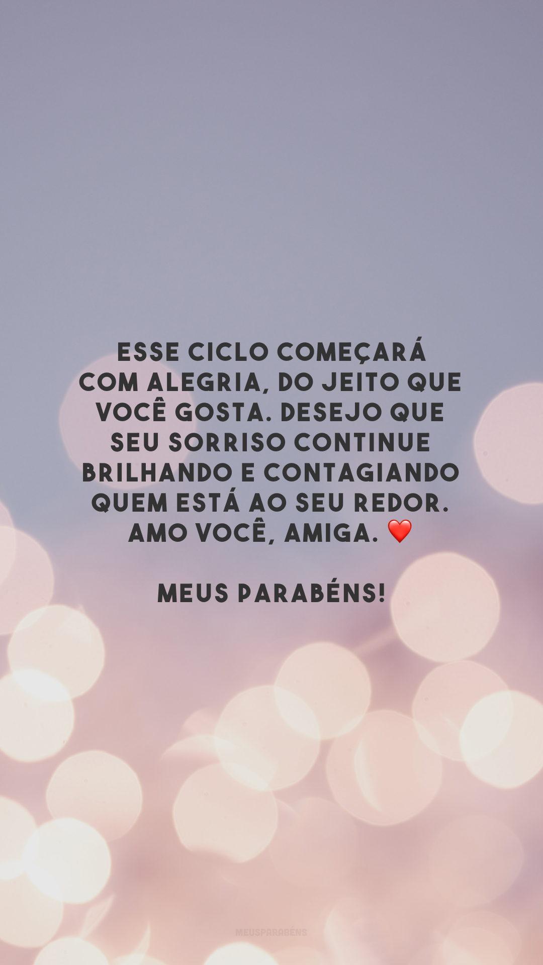 Esse ciclo começará com alegria, do jeito que você gosta. Desejo que seu sorriso continue brilhando e contagiando quem está ao seu redor. Amo você, amiga. ❤️ Meus parabéns!